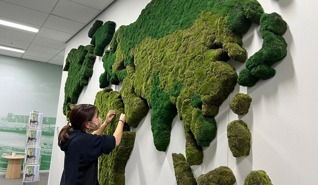 造花の苔を使って縦3m横7mの壁に世界地図を制作しました。