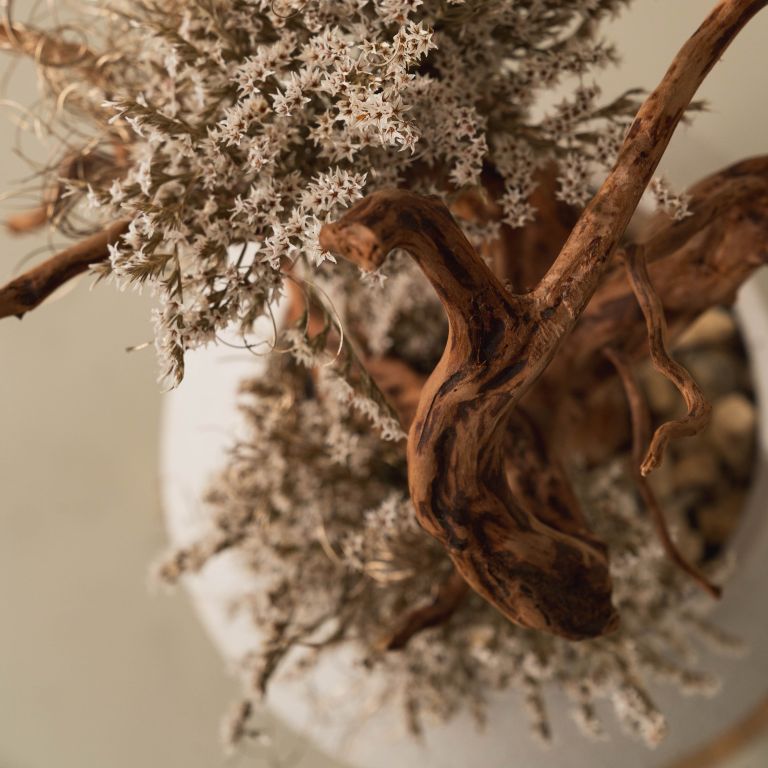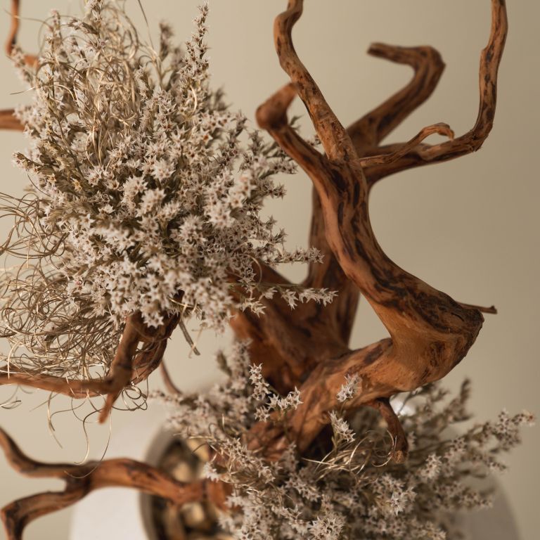 ドライウッドとリアルな質感のドライフラワーを使用し、ナチュラルな雰囲気がありながらも思わず目を惹く存在感で空間のアイコンになるように仕上げました。